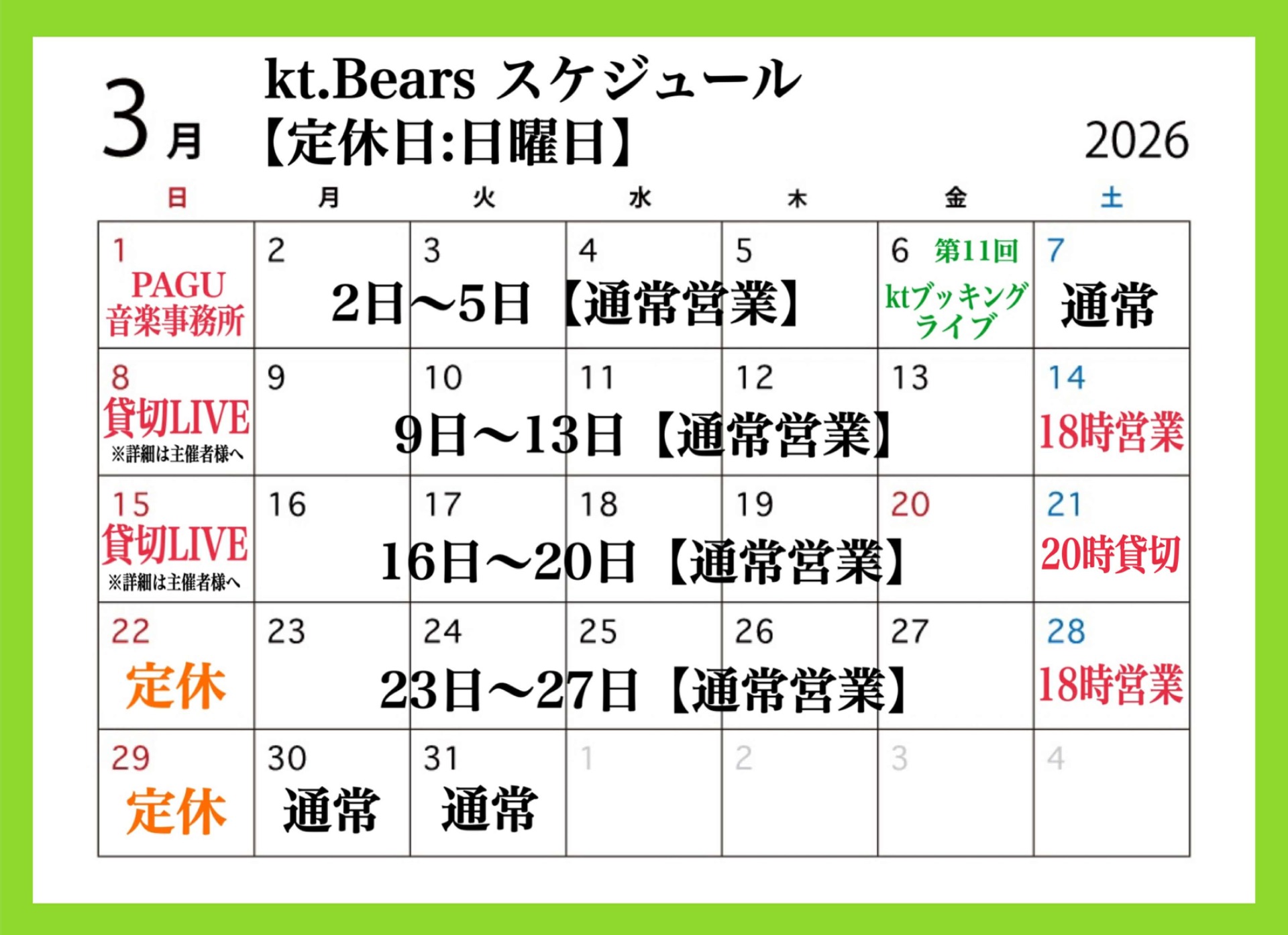 定休日 : 日曜日